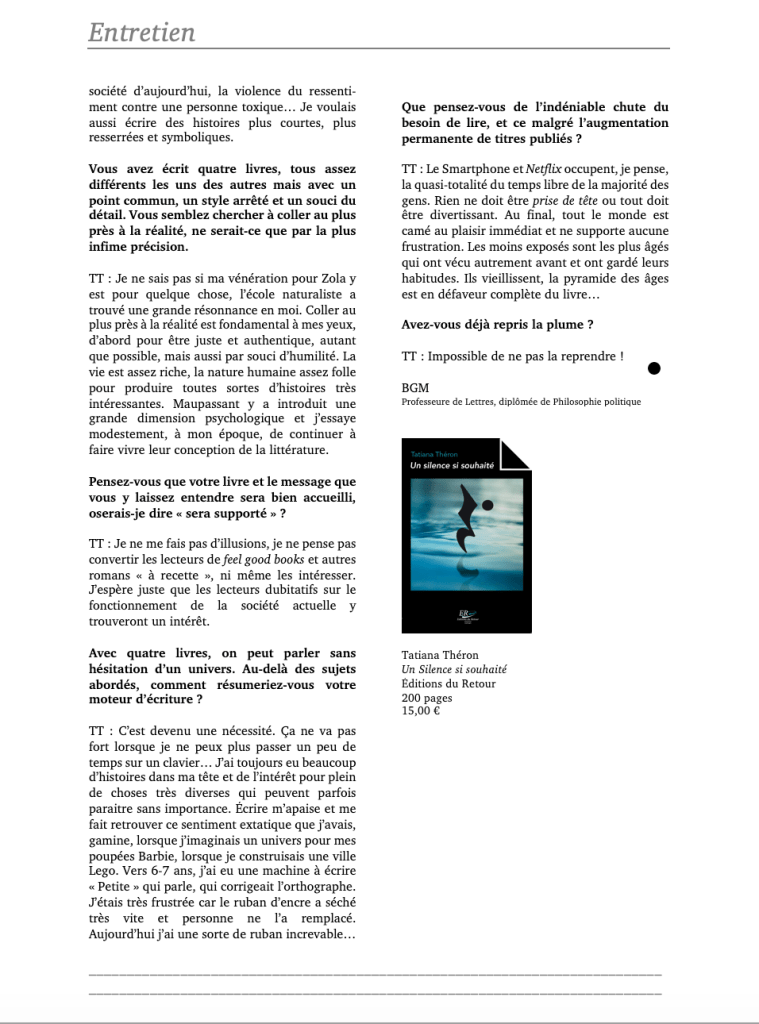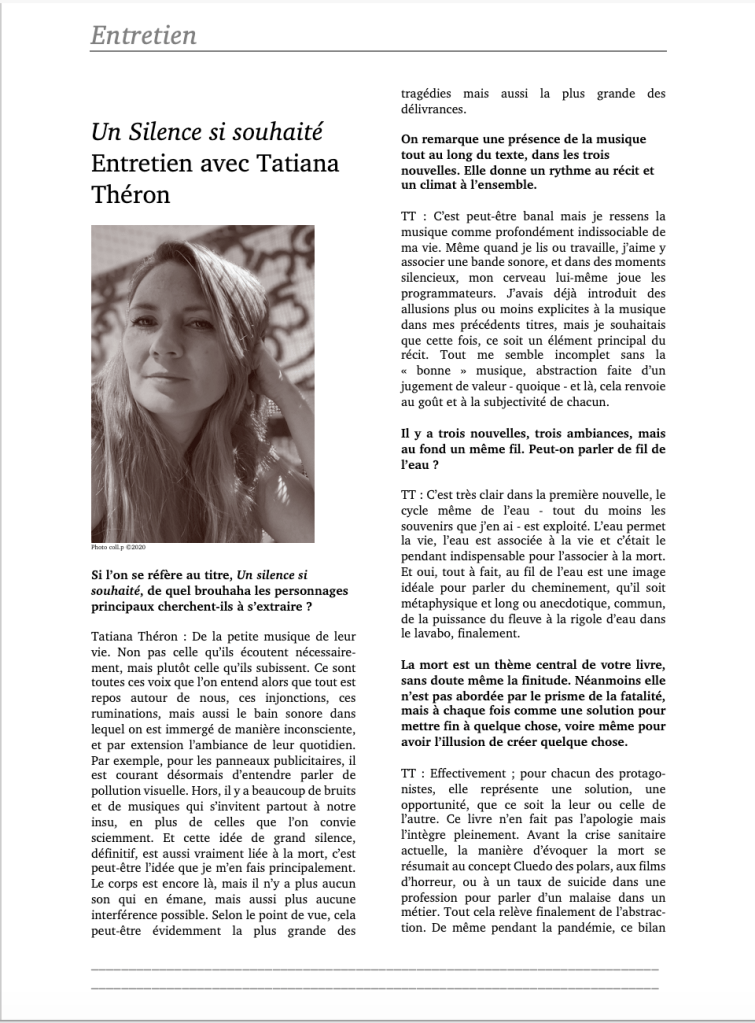 - Entretien avec Tatiana Théron sur Un silence si souhaité, juillet 2020