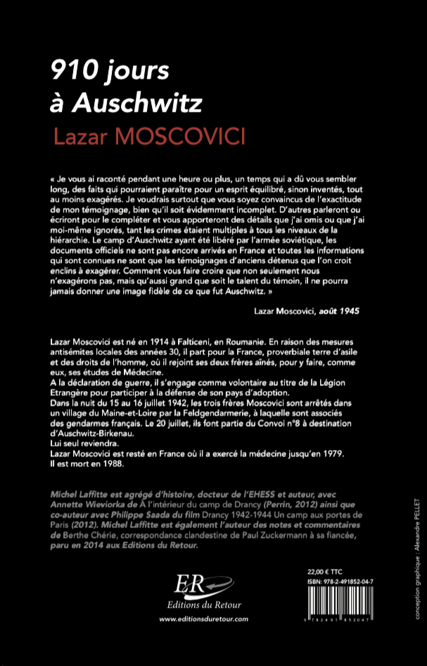 Nouvelle édition de 910 jours à Auschwitz de Lazar Moscovici, témoignage de sa déportation à Auschwitz-Birkenau de juillet 1942 à janvier 1945.